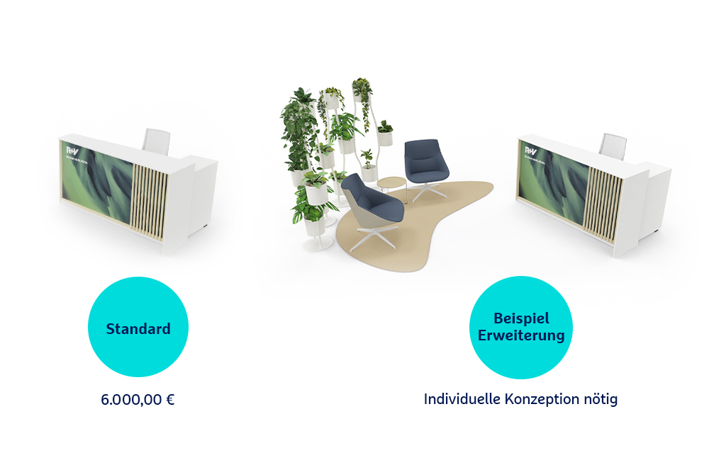 • Der angebotene Empfangsbereich lässt sich je nach Raumgröße um beispielsweise einen Loungebereich erweitern. Dies ist auf individuelle Anfrage möglich. Der Aufpreis startet ab 1.500 € netto.