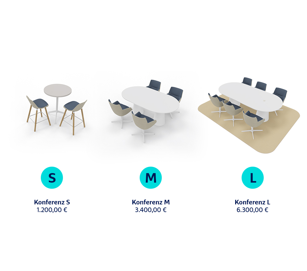 Neben den Kundenberatungen ist auch der Austausch im Team ein wichtiger Baustein. Je nach Raumgröße oder Teamkonstellation bieten wir Ihnen verschiedene Möglichkeiten Ihre Konferenzbereiche zu gestalten.